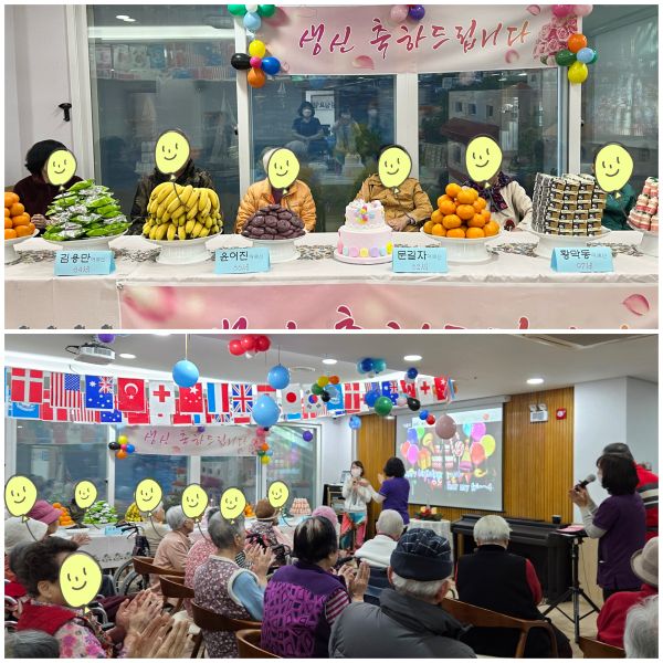 ¿À´ÃÀº ¸Å¿ù ù° ÁÖ ±Ý¿äÀÏ¿¡ ÁøÇàµÇ´Â ¾î¸£½Å »ý½ÅÀÜÄ¡ ³¯·Î, 12¿ù »ý½ÅÀ» ¸ÂÀ¸½Å ±èOO, ±èOO, À±OO, ¹®OO, ȲOO, ±ÇOO ¾î¸£½Å ¿©¼¸ ºÐÀ» ¸ð½Ã°í ¸ðµÎ°¡ ÇÔ²² ÃàÇÏ ³ë·¡¸¦ ºÎ¸£¸ç µû¶æÇÑ ½Ã°£À» º¸³Â½À´Ï´Ù. À±OO ¾î¸£½Å º¸È£ÀÚ´Ô²²¼ °úÀÏÀ», ȲOO ¾î¸£½Å º¸È£ÀÚ´Ô²²¼ ¶±°ú ¿ä±¸¸£Æ®¸¦, ¹®OO ¾î¸£½Å º¸È£ÀÚ´Ô²²¼ »§°ú À½·á¸¦ Á¤¼º²¯ ÁغñÇØ Áּż ¾î´À ¶§º¸´Ù dz¼ºÇÑ ÀÜÄ¡°¡ µÇ¾ú½À´Ï´Ù. ÀÚ¿øºÀ»ç ¼±»ý´ÔÀÇ Èï°Ü¿î ³ë·¡¿¡ ¾î¸£½Åµé²²¼ ¹Ú¼ö¿Í ÇÕâÀ¸·Î ÇÔ²²ÇϽøç Áñ°Å¿öÇϼ̰í, ÈïÀÌ ¿À¸¥ ºÐµéÀº ¾î±úÃã±îÁö Ã߸ç ÇູÇÑ ½Ã°£À» º¸³»¼Ì½À´Ï´Ù. Âü¼®ÇÑ ¸ðµç ºÐµéÀÌ ¼·Î¸¦ ÃàÇÏÇÏ¸ç ¿ôÀ½²ÉÀ» ÇÇ¿î ¶æ±íÀº ÇÏ·ç¿´À¸¸ç, °Ç°°ú ÇູÀ» ±â¿øÇÏ´Â µû¶æÇÑ ºÐÀ§±â°¡ °¡µæÇß½À´Ï´Ù. ¶ÇÇÑ À̹ø ÀÜÄ¡´Â ÇÑ ÇØ¸¦ ¸¶¹«¸®ÇÏ´Â ¼Û³âȸÀÇ Àǹ̵µ ÇÔ²² ´ã°Ü ´õ¿í Á¤¼º½º·´°Ô ÁغñµÇ¾úÀ¸¸ç, ´öºÐ¿¡ ¾î¸£½Åµé²²¼´Â ¿¬¸»ÀÇ µû¶æÇÑ Ãß¾ïÀ» ¸¶À½¼Ó¿¡ ¼ÒÁßÈ÷ °£Á÷ÇÏ½Ç ¼ö ÀÖ¾ú½À´Ï´Ù. ¸ðµÎ°¡ ÇÔ²² Áñ°Å¿î ÇϷ縦 º¸³»¼Ì½À´Ï´Ù.
