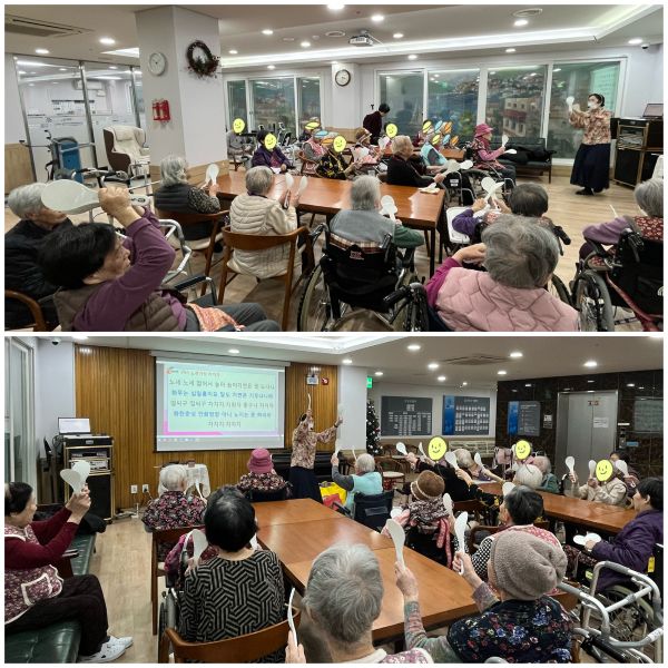 ¿À´Ã ³ë·¡±³½Ç¿¡¼´Â ¡®µ¿ÀüÀλý¡¯À» ÁÖÁ¦·Î ¾î¸£½Åµé°ú Áñ°Å¿î ½Ã°£À» º¸³Â½À´Ï´Ù. ÀÎ»ç ³ª´® ÈÄ ¹ß¼º°ú È£Èí ¿¬½ÀÀ¸·Î ¸ö°ú ¸¶À½À» Ç®°í, °¡»ç¸¦ ÇÔ²² ÀÐÀ¸¸ç ¶°¿À¸£´Â °¨Á¤À» À̾߱âÇß½À´Ï´Ù. ÀÌ¾î¼ ¸á·Îµð µû¶ó ºÎ¸£±â¿Í Àüü µû¶ó ºÎ¸£±â ¿¬½ÀÀ» ÁøÇàÇϰí, ¼Õ°¡¶ôÀ¸·Î µ¿Àü ¸ð¾çÀ» ¸¸µå´Â °£´ÜÇÑ ¼ÕÀ¯Èñ¸¦ ´õÇØ Èï¹Ì¸¦ ³ô¿´½À´Ï´Ù. °»ç¿Í ÇÔ²² ³ë·¡¸¦ ºÎ¸£°í, Àͼ÷ÇÑ Ãß°¡ °îµµ µû¶ó ºÎ¸£¸ç ÀÎÁö¡¤±â¾ï·Â Çâ»ó¿¡ µµ¿òÀ» ÁÖ¾ú°í ¸¶Áö¸·À¸·Î È£Èí üÁ¶¿Í °î ¿ÏâÀ¸·Î ¼ºÃë°¨ ÀÖ°Ô ¸¶¹«¸®Çß½À´Ï´Ù. ¿À´Ãµµ ¸ðµÎ Áñ°Ì°í ¸¸Á·½º·¯¿î ÇϷ縦 º¸³»¼Ì½À´Ï´Ù.