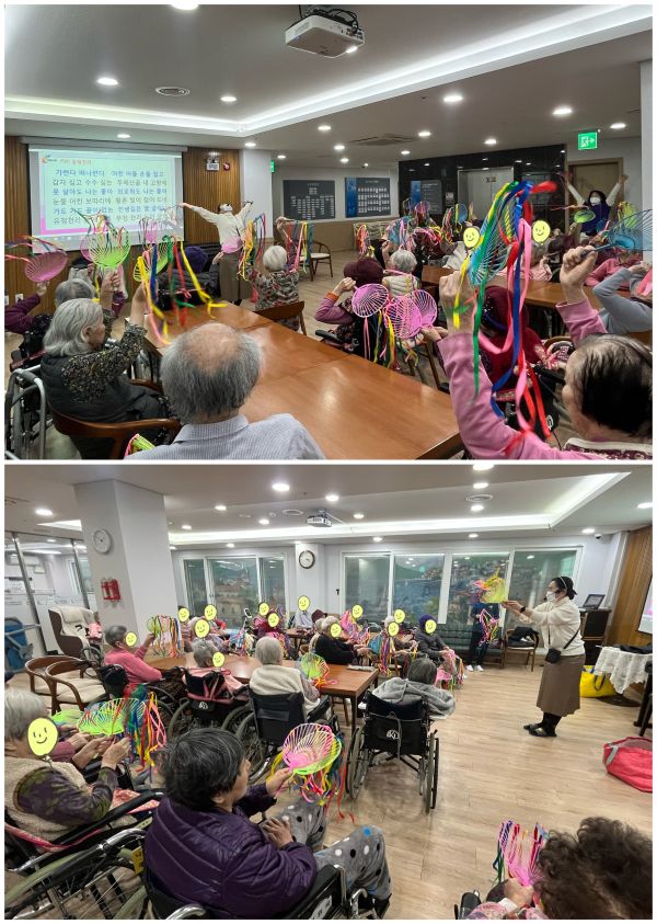 ¿À´ÃÀº ¡®¼Ò¸®²É/À¯Á¤Ãµ¸®¡¯¸¦ ÁÖÁ¦·Î ¾î¸£½Åµé°ú Áñ°Ì°í Ȱ±âÂù ½Ã°£À» º¸³Â½À´Ï´Ù. ÀÎ»ç ³ë·¡¿Í ½Åü À²µ¿À¸·Î ¸öÀ» Ç®¸ç ºÐÀ§±â¸¦ ¹àÈù µÚ, ¡®À¯Á¤Ãµ¸®¡¯ À½¾ÇÀÇ Àǹ̿¡ ´ëÇØ À̾߱⸦ ³ª´©°í ¡®Á¤ÀÌ ÀÖÀ¸¸é õ¸® ±æµµ ¸ÖÁö ¾Ê´Ù¡¯ ´Â ¶æÀ¸·Î ¿¾ ¿µÈ Æ÷½ºÅÍ À̹ÌÁö¸¦ ÇÔ²² º¸¸ç °¡Á·, Ä£±¸, ÀÌ¿ô°úÀÇ Á¤ÀÌ »î¿¡¼ Å« ÈûÀÌ µÇ¾ú´Ù´Â °æÇèÀ» °øÀ¯ÇÏ¿´½À´Ï´Ù. ÀÌÈÄ À½¿ø¿¡ ¸ÂÃç Çã¹ÖÀ¸·Î ³ë·¡¸¦ ºÎ¸£¸ç Ãß¾ïÀ» ȸ»óÇϰí, ºÎä¿Í ¸®º»À» Ȱ¿ëÇÑ ½Åü Ȱµ¿°ú ¹ÚÀÚ¿¡ ¸ÂÃá ¾Ç±â ¿¬ÁÖ, ³ë·¡ ºÎ¸£±â Ȱµ¿¿¡ Àû±ØÀûÀ¸·Î Âü¿©Çϼ̽À´Ï´Ù. ¾î¸£½Åµé²²¼´Â ¡°¿¾³¯ ³ë·¡¶ó¼ ´õ ½ÅÀÌ ³´Ù¡±°í ¸»¾¸ÇϽøç Àü¹ÝÀûÀ¸·Î Áñ°Ì°í ¸¸Á·½º·¯¿î ½Ã°£À» º¸³»¼Ì°í, ¿À´Ãµµ ÇູÇÑ ½Ã°£ÀÌ µÇ¾ú½À´Ï´Ù.